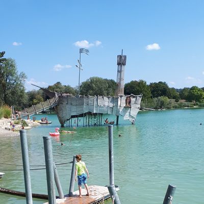 The Schloßsee near Salem boasts well-maintained sunbathing areas, an exciting pirate ship, and free admission.
