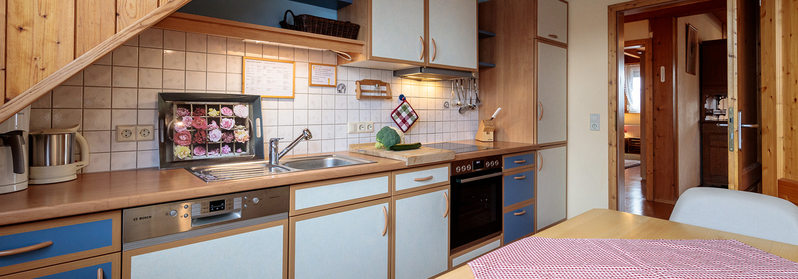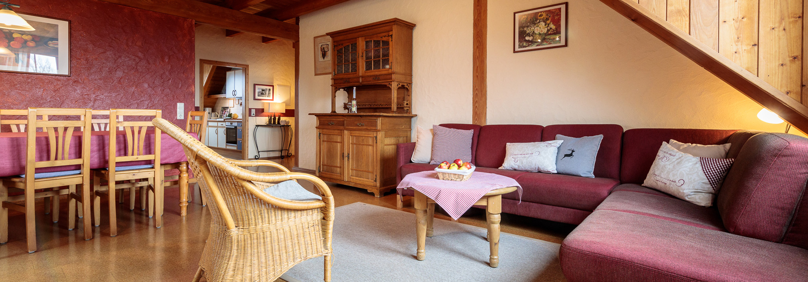On the second floor of the new building section in the holiday house is the 'Erntedank' (Thanksgiving) apartment. A separate kitchen and a large living room with a dining table for 6-10 people are its trademarks. This layout is ideal for two families to cook and dine together, especially when the other family is staying in the 'Sommerhimmel' apartment.